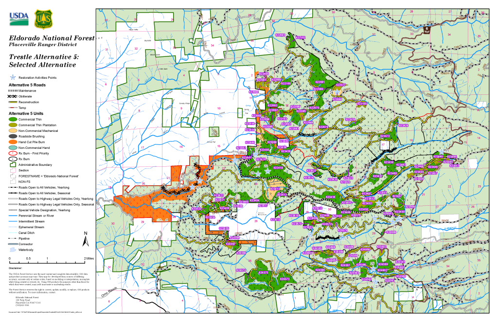 Above is a map of the Trestle Forest Health Project (TFHP), a plan to treat 16,000 acres of land south and east of Grizzly Flats to improve forest health and fire resiliency. On September 11, 2017, after four years of proposals and environmental impact studies, Eldorado National Forest (ENF) Supervisor Lawrence Crabtree signed his decision to thin thousands of acres of forest. However, by the summer of 2021 only 270 acres of fuel reduction were complete, according to TFHP partner National Wild Turkey Federation. So, what went wrong?