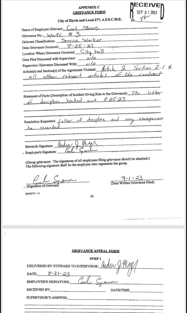 The American Federation of State, County, and Municipal Employees (AFSCME) Local 277 has filed a formal grievance against the City of Elyria. The grievance is on behalf of City of Elyria employee, Carl Spanos.