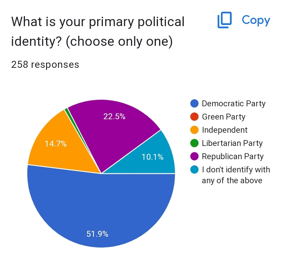Next, let’s look at how participants in this poll identify politically. 258 participants responded to this question. The number of those identifying as “Democratic Party” is somewhat lower than Elyria’s actual electorate, while those identifying as Independent or not-otherwise affiliated are somewhat higher. Those identifying as “Republican Party” are fairly reflective of Elyria’s electorate.